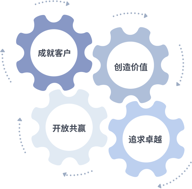 成就客户是一切决策的出发点,创造价值是衡量所有工作的标准,追求卓越是太阳成集团tyc33455做事做人的态度,开放共赢是太阳成集团tyc33455的格局也是最终的结果。价值观的齿轮环环相扣,推动着组织里的每个人不断向前。